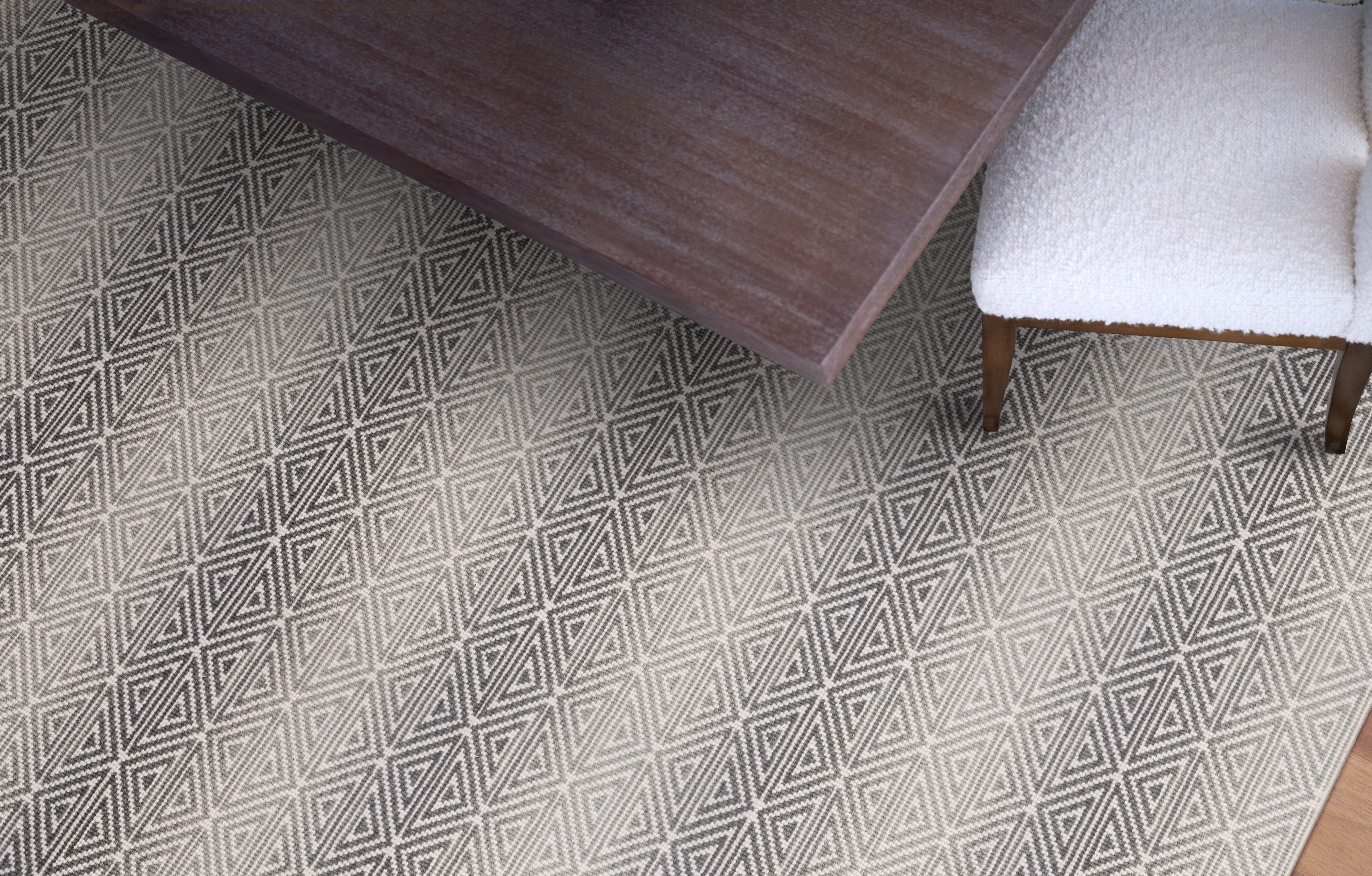 Introducing Korey, a captivating fusion of classic design and modern elegance. Korey reimagines the timeless diamond motif with a fresh, contemporary touch. This geometric masterpiece, crafted with the refined Wire Wilton technique, boasts an all-loop construction that ensures both durability and sophistication. Korey enchants with its graceful color ombre, softly transitioning shades across the carpets width.